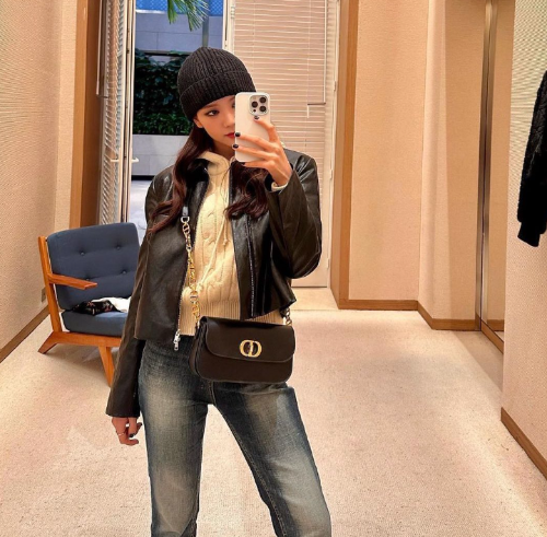 이 늦가을 패션은 올블랙 착장을 했습니다. 이 역시 하체에 볼륨감을 부여하는 와이드진과 유광라이더 자켓으로 몸집에 볼륨감을 부여했지만, 몸에 핏되는 크롭탑으로 센스있게 날씬한 체형을 드런낸 모습입니다. 여기에 역시 뺄 수 없는 베라모도 힙한 패션에 기여합니다.