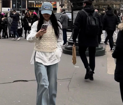 사복에서 지수는 모자템을 잘 활용하는 것 같습니다. 아무래도 유명 연예인이기 때문에 길에 혼자 돌아다니면서 전부를 노출하기는 아무래도 힘든 상황이겠죠. 통이 넓은 와이드 연청 바지에, 뷔스티에 조끼를 매칭한 모습입니다. 이번에도 모자를 바지색과 통일하면서 전체적으로 통일 감을 주었습니다. 이 역시 채도 매칭을 잘 활용한 모습이네요. 곧 시작될 새학기 봄 코디에 참고하는 것도 좋을 것 같습니다.