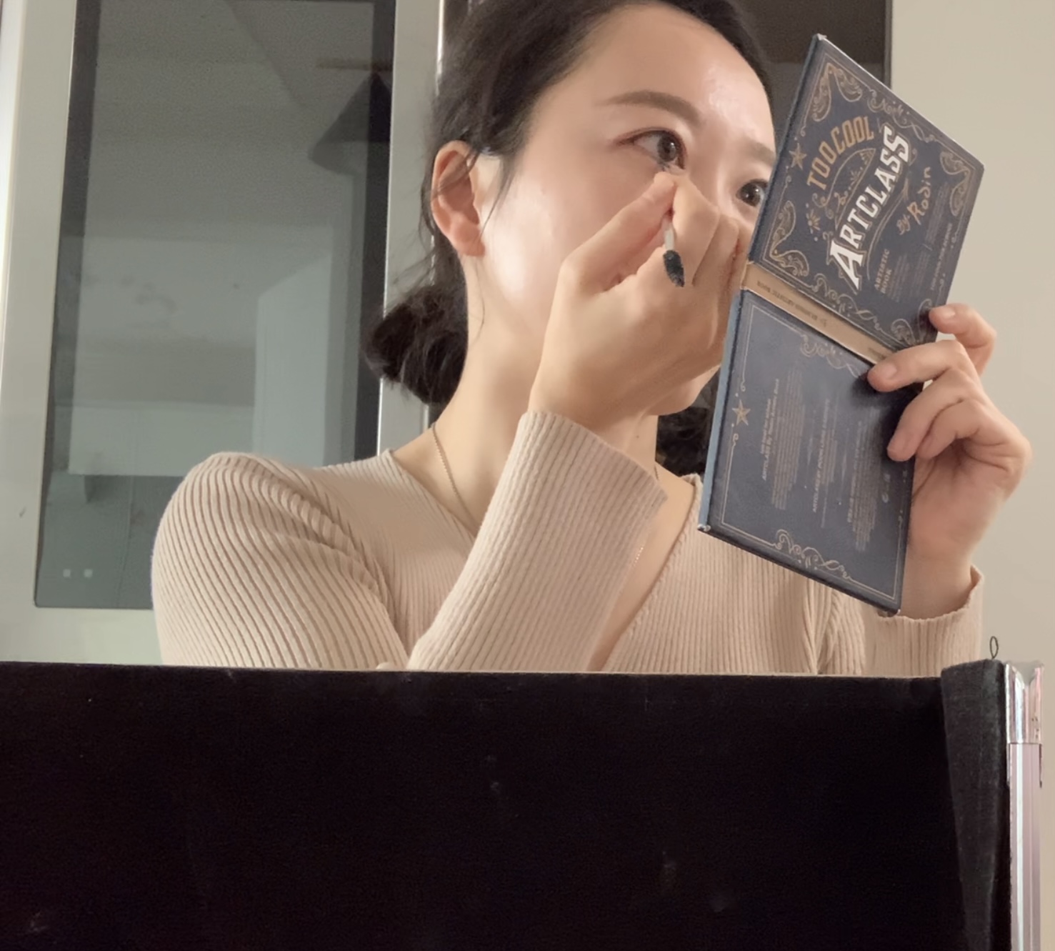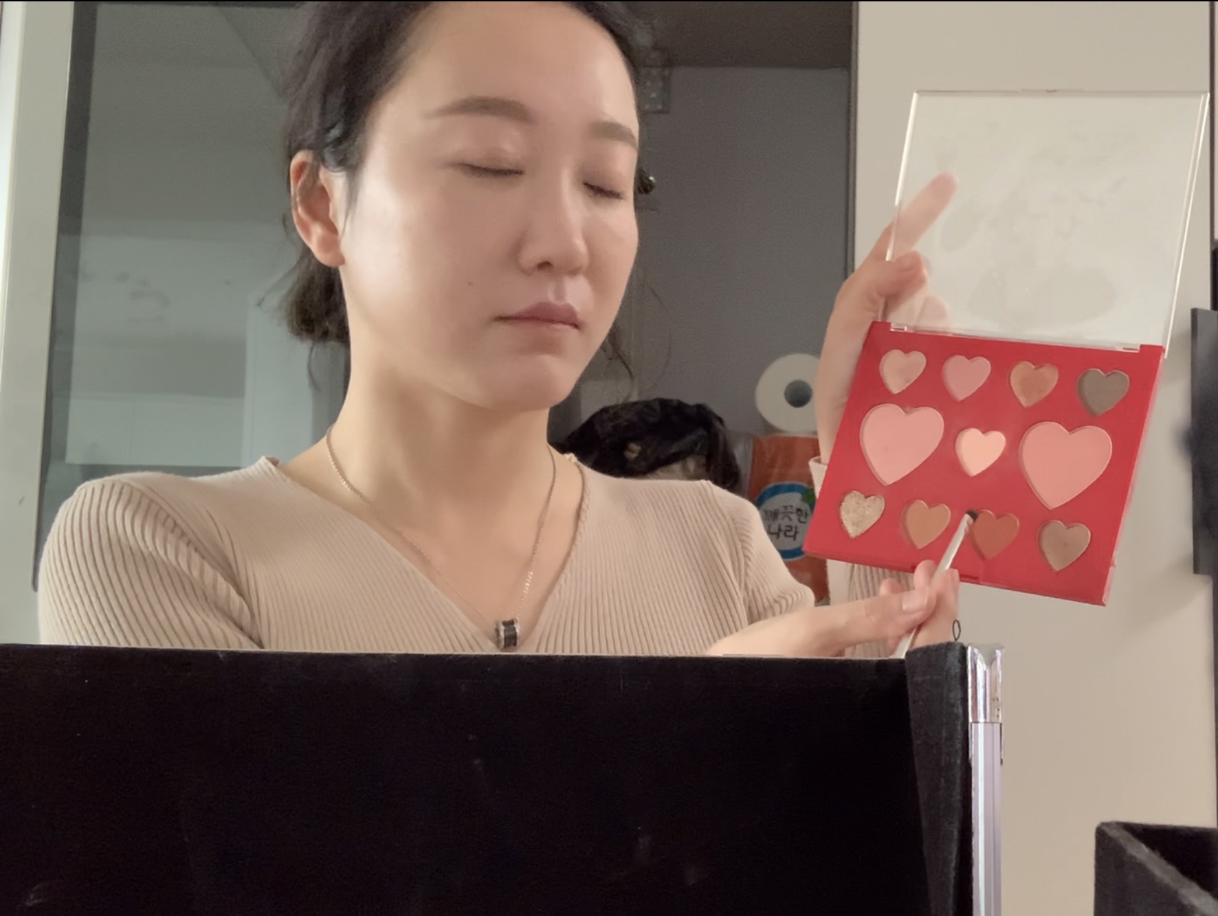 옅은 핑크로 아이홀 배경을 깔고 아래 속눈썹 쪽도 같이 색을 칠해 통일감을 준다.