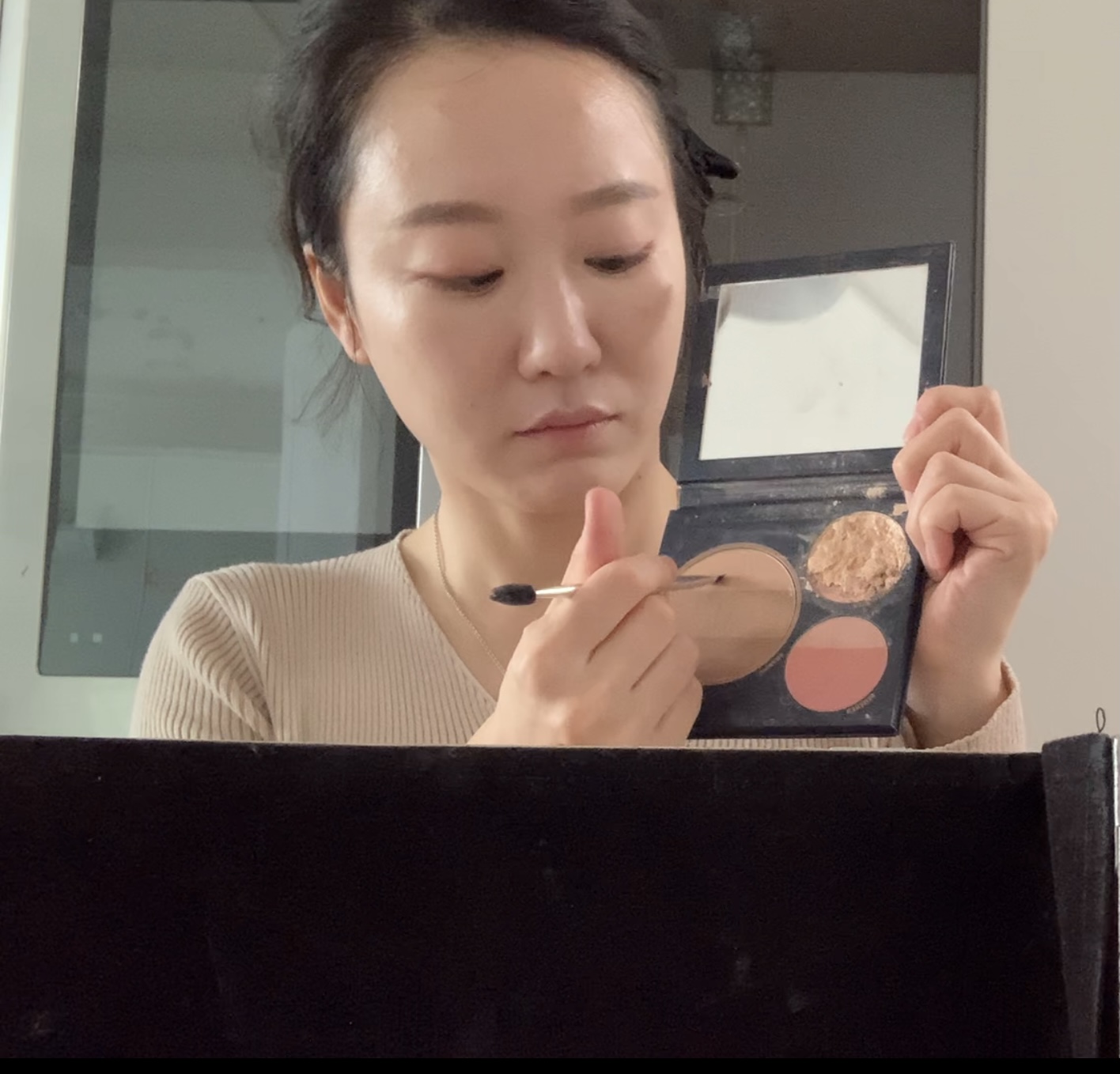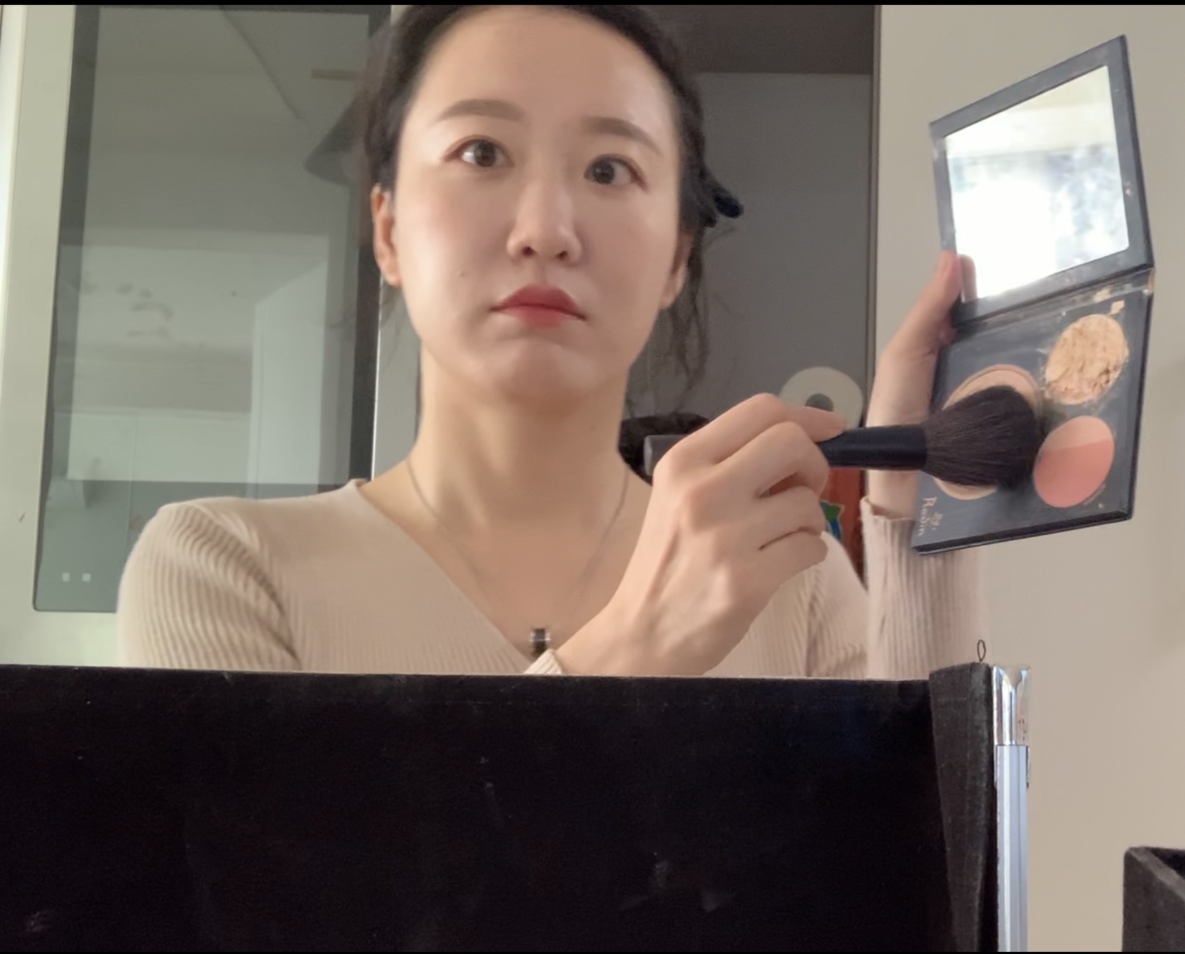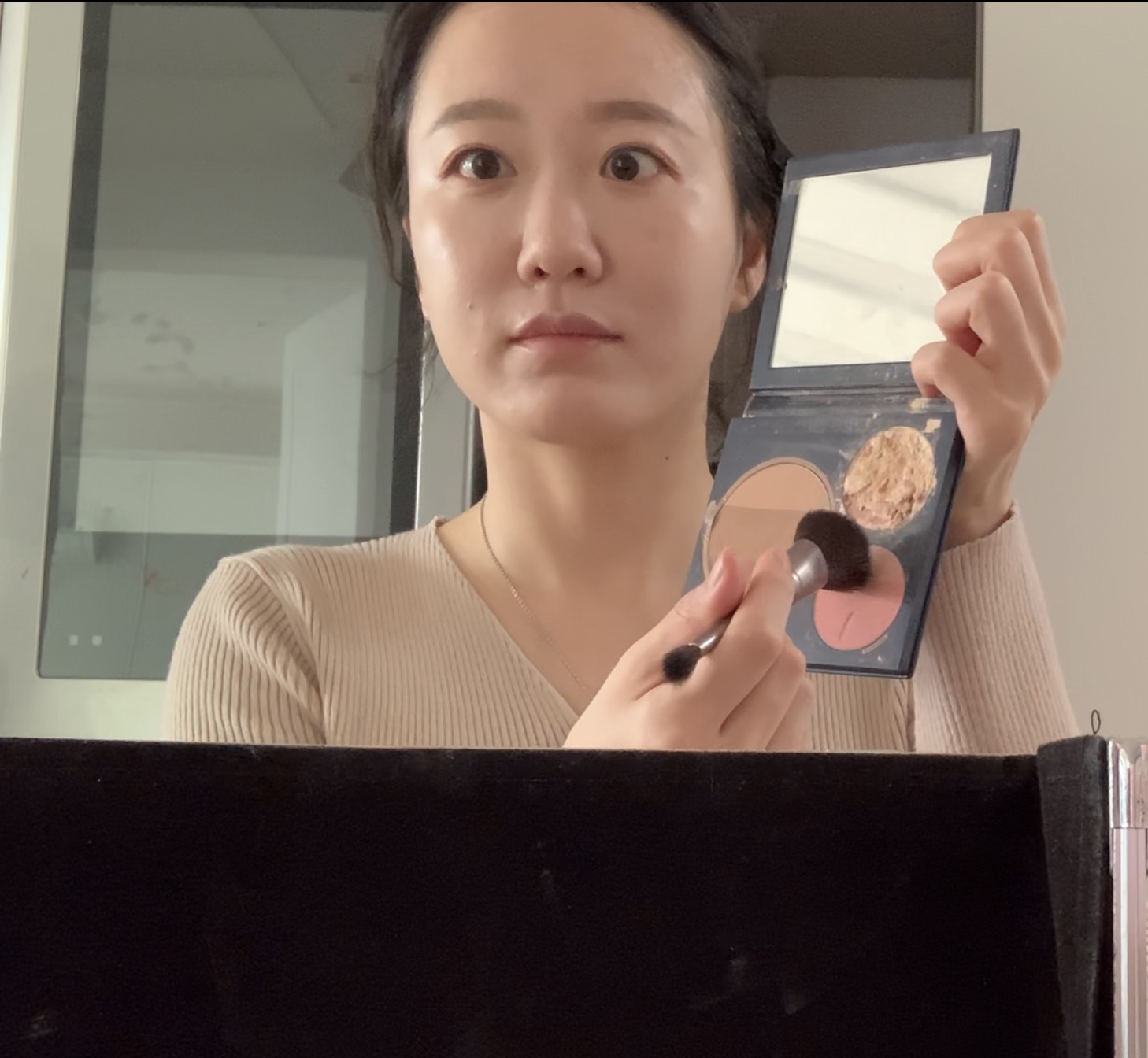 웜톤 블러셔를 얇게 그려서 살짝 색을 띄어올린다.