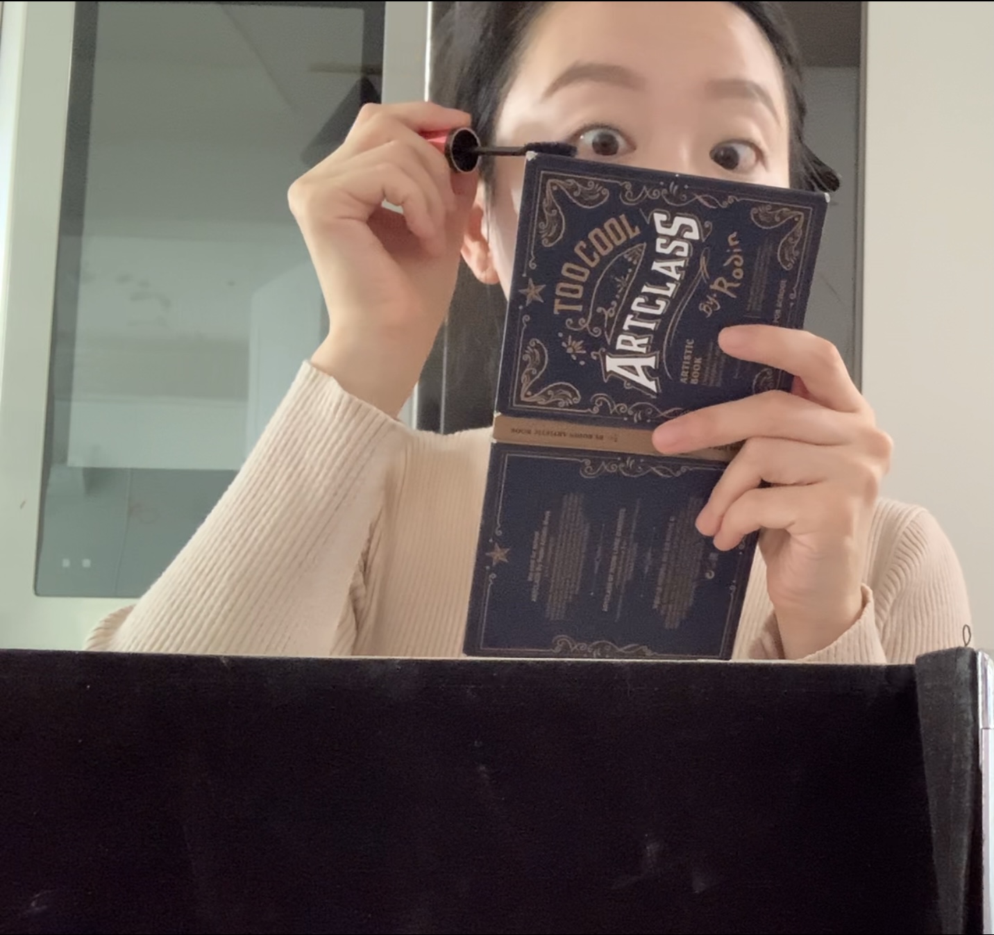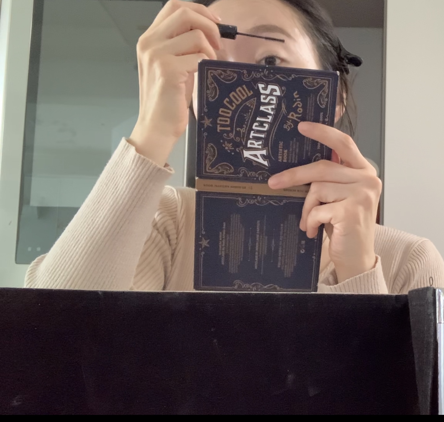 속눈썹 컬링을 위한 뷰러를 하고 마스카라를 한다